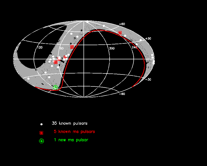 So far about 80% of the sky in the declination range 4 < Dec < 42 (see the sky coverage plot) was succesfully observed, resulting in the detection of 35 known "normal pulsar", 5 known "millisecond pulsar" and 1 new millisecond pulsar PSR J0030+0600.